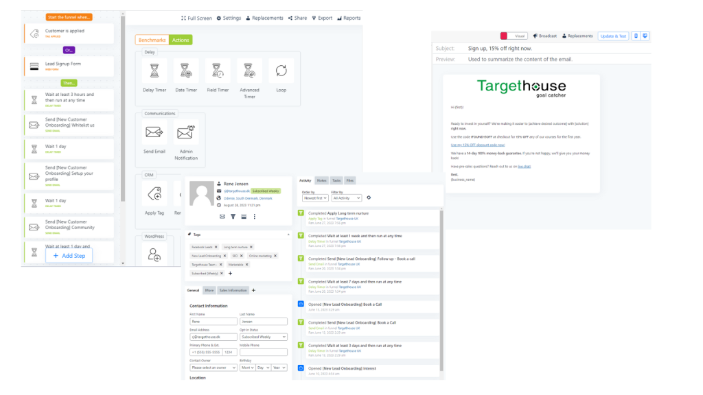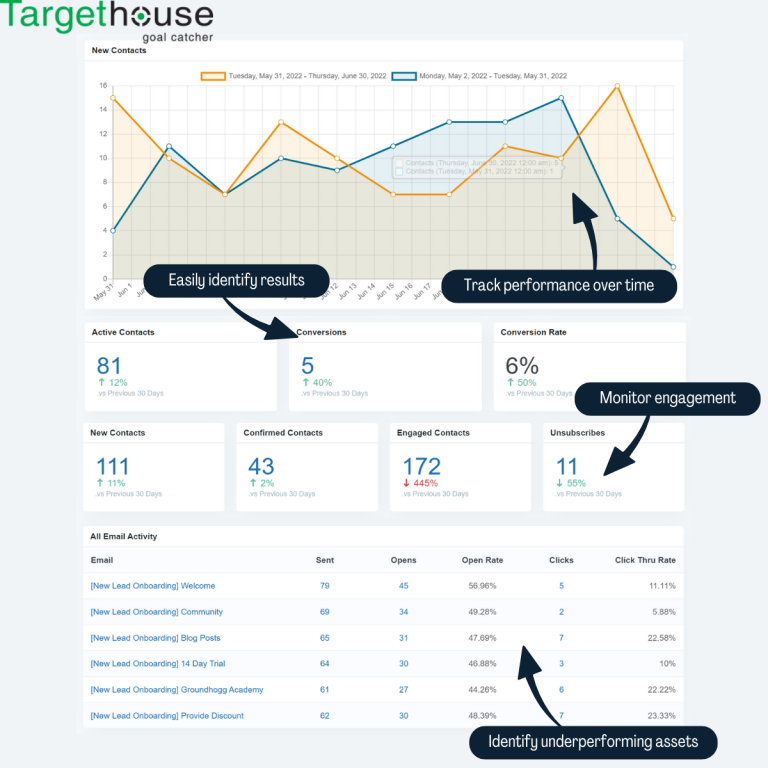 Targethouse Goal Catcher tilbyder en brugervenlig marketingautomatiserings- og CRM-løsning til en fast pris. Dette kan spare dig hundredvis eller endda tusindvis af kroner om året på gebyrer for marketingautomatisering og CRM-software.